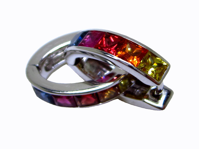 14K White gold multi colour sapphire oval hoop earrings. The oval huggie type hoop earrings measure 13.75mm x 10.8mm are set with five very good quality channel-set sapphires that weigh 1.50ct complete. The earrings weigh 3.3 grams complete.