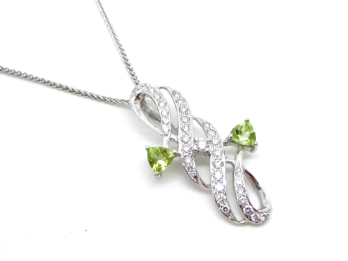 18ct White gold Peridot & diamond pendant set on a white gold Spiga style chain.The two trillion-cut matching peridots mirror each other and are set amongst the flowing diamond set design of this beautiful pendant.