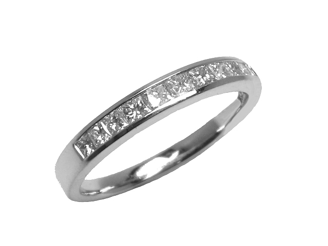 18ct white gold half eternity ring comprising of eleven well matched, princess-cut channel set diamonds.