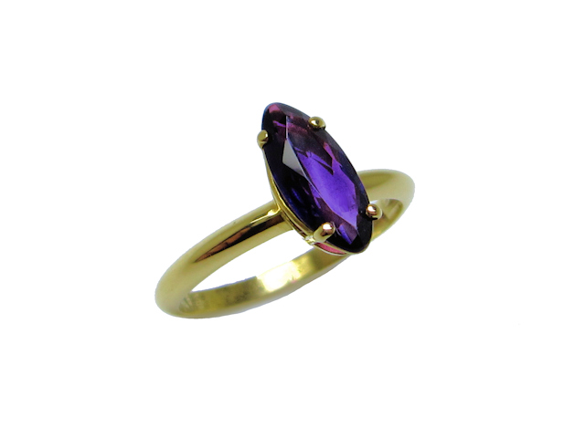 18ct yellow gold single stone amethyst ring. The 11mm x 5.5mm marquise shaped claw set amethyst is a beautiful deep rich purple colour with good clarity.