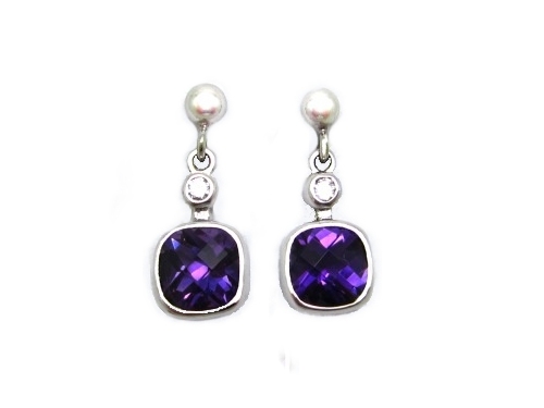 9ct White gold rub-over set, cushion shaped amethyst drop earring.The checkerboard-cut amethyst is a lovely rich purple colour with good clarity and has a brillint-cut diamond set above.The drop earrings measure 18mm in depth.