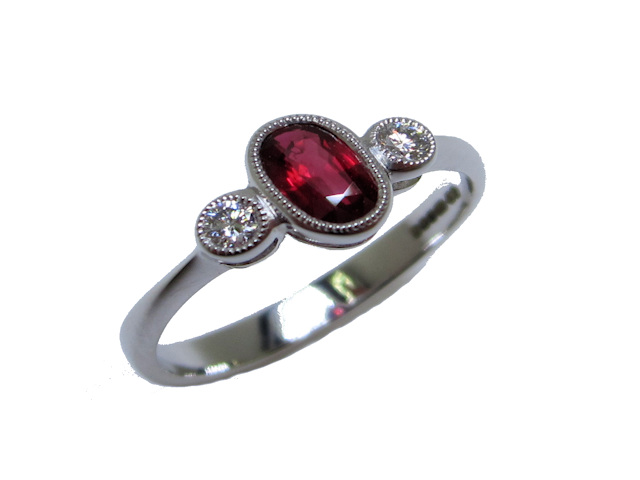9ct White gold three stone Ruby & Diamond ring. The Centre 6mm x 4mm rub-over set oval Ruby is a pleasing red colour which is a good clarity stone. The Centre Ruby is set on each side with a brilliant-cut diamond witch is also set in the rub-over bead edge style.