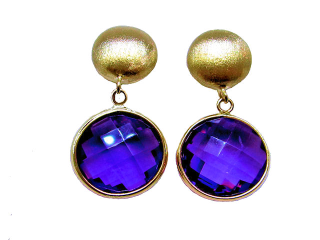 9ct Yellow gold Amethyst drop earrings. The top button shaped and brushed finish bead measures 7.5mm from which hangs an 11mm round rub-over set, checkerboard Amethyst stone. The amethyst is a rich purple colour which is highlighted by the checkerboard cutting.