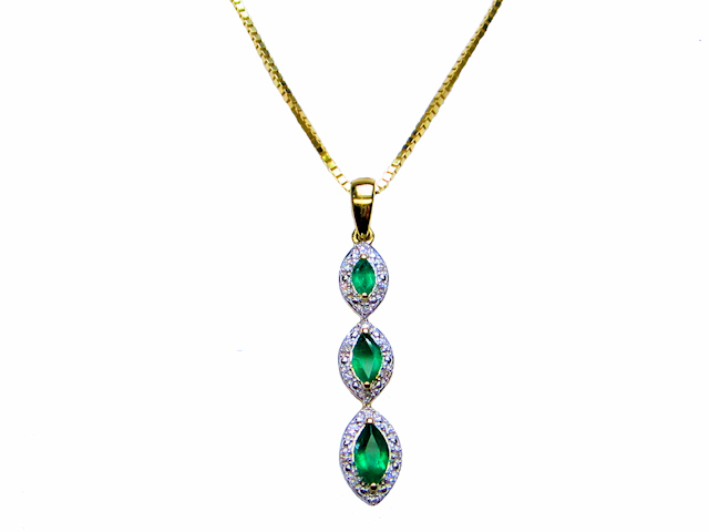 9ct Yellow gold triple cluster pendant made up of three graduated Marquise emeralds which are surrounded by brilliant-cut diamonds. This colourful pendant is set on a 9ct yellow gold 18″ Venetian chain.