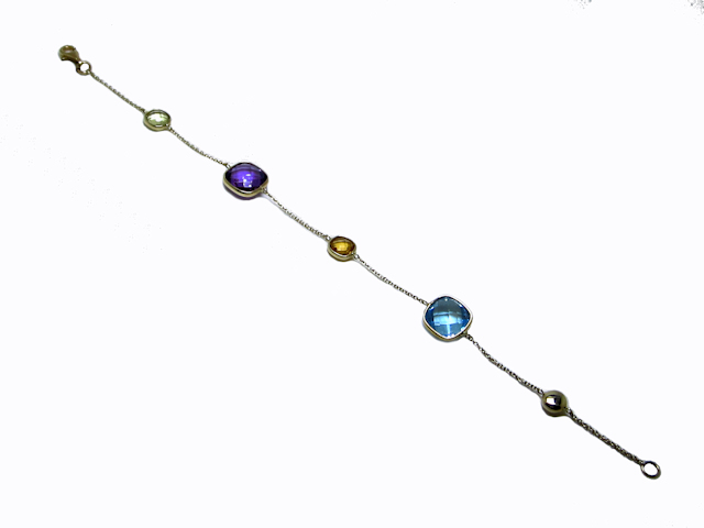 9ct Yellow gold Multi stone bracelet with rub-over set, cushion shaped and checkerboard-cut blue Topaz, Citrine, Amethyst and lemon quartz. The stones are interspersed with sections of fine belcher link chain.