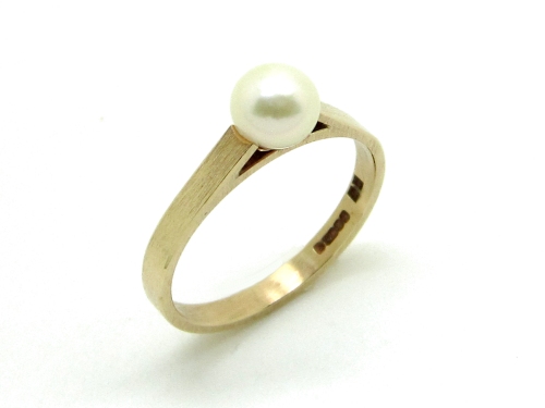 9ct Yellow gold single stone pearl ring set with a 5.5mm cultured pearl which is mounted on a mat finished square section shank.