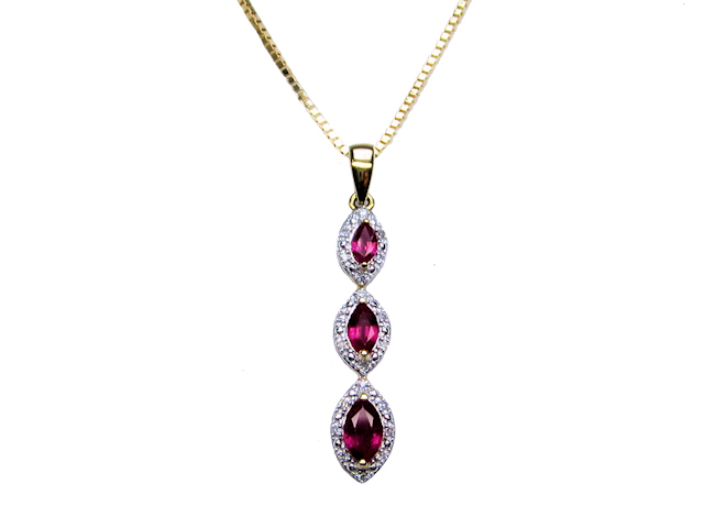 9ct yellow gold triple cluster pendant. The three graduated Marquise Ruby and diamond clusters are set on a yellow gold Bale and attached to a 9ct yellow gold Venetian chain that measures 18″ in length.