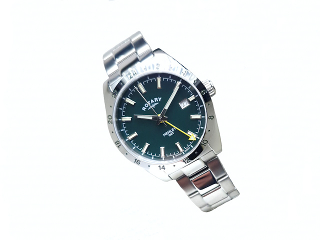 Gents stainless steel Rotary Henley GMT wrist watch on bracelet. The dark green luminous batons dial has hours, minutes and seconds hands and date function situated at the 3 o clock position. This striking watch has a yellow separate hours time zone hand and is fitted with a sapphire glass, and is water resistant to 100 meters.