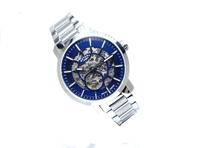 Gents Stainless steel Automatic Rotary Skeleton watch on three row polished and brushed steel bracelet. The blue skeleton dial has hours, minutes and seconds hands and has a sapphire crystal glass both front and back this striking watch is waterproof to 50 meters.