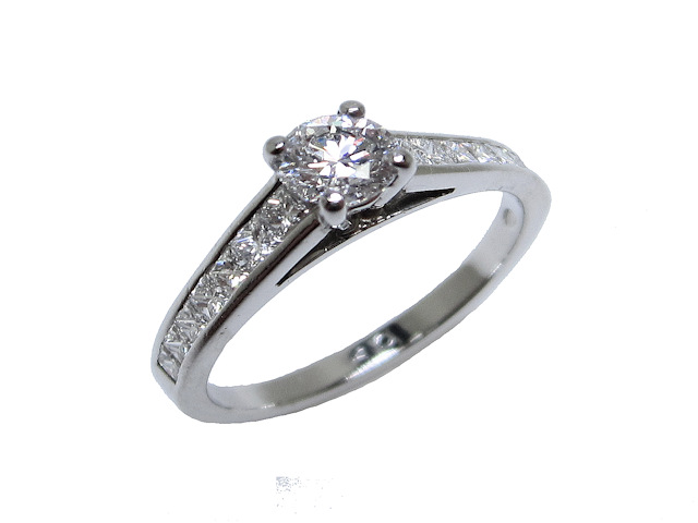 Platinum Diamond ring set with Fifteen stones. The Centre four claw set brilliant-cut diamond is a bright stone that is complimented by fourteen well matched, graduated princess-cut diamonds, seven set in each shoulder. The Centre brilliant-cut diamond : colour (G) clarity (VS ) weighs .40ct . The shoulder Princess-cut diamonds : colour (G) clarity (VS) weigh .40ct complete.